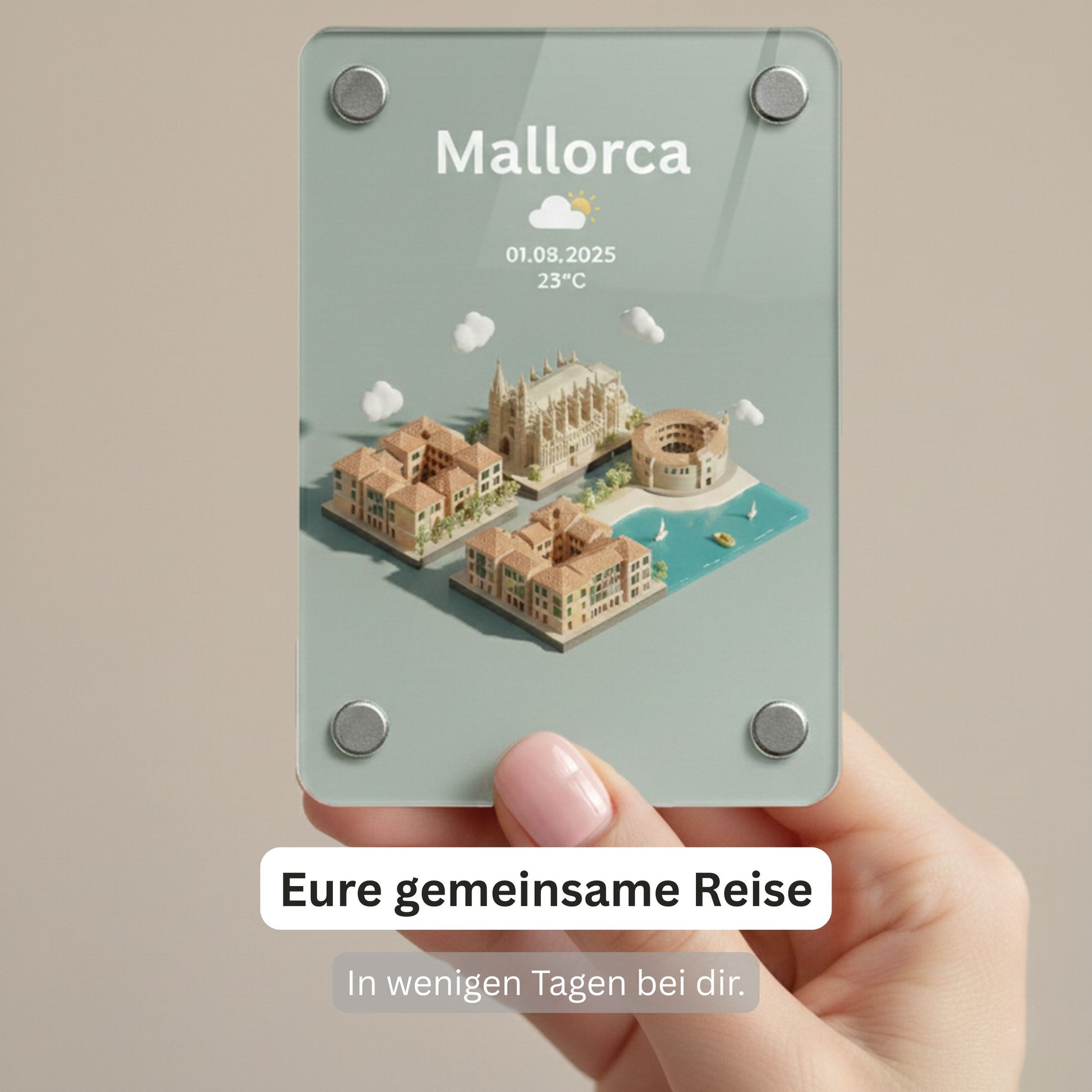 Dein stilvoller Acryl-Magnet (7x10 cm) hält deine schönsten Reisemomente fest – auf Kühlschrank, Whiteboard oder jeder magnetischen Oberfläche. Ob Lieblingsurlaubsziel, Heimatstadt oder der Ort eures ersten Dates – dieses kleine Kunstwerk erzählt deine Geschichte.