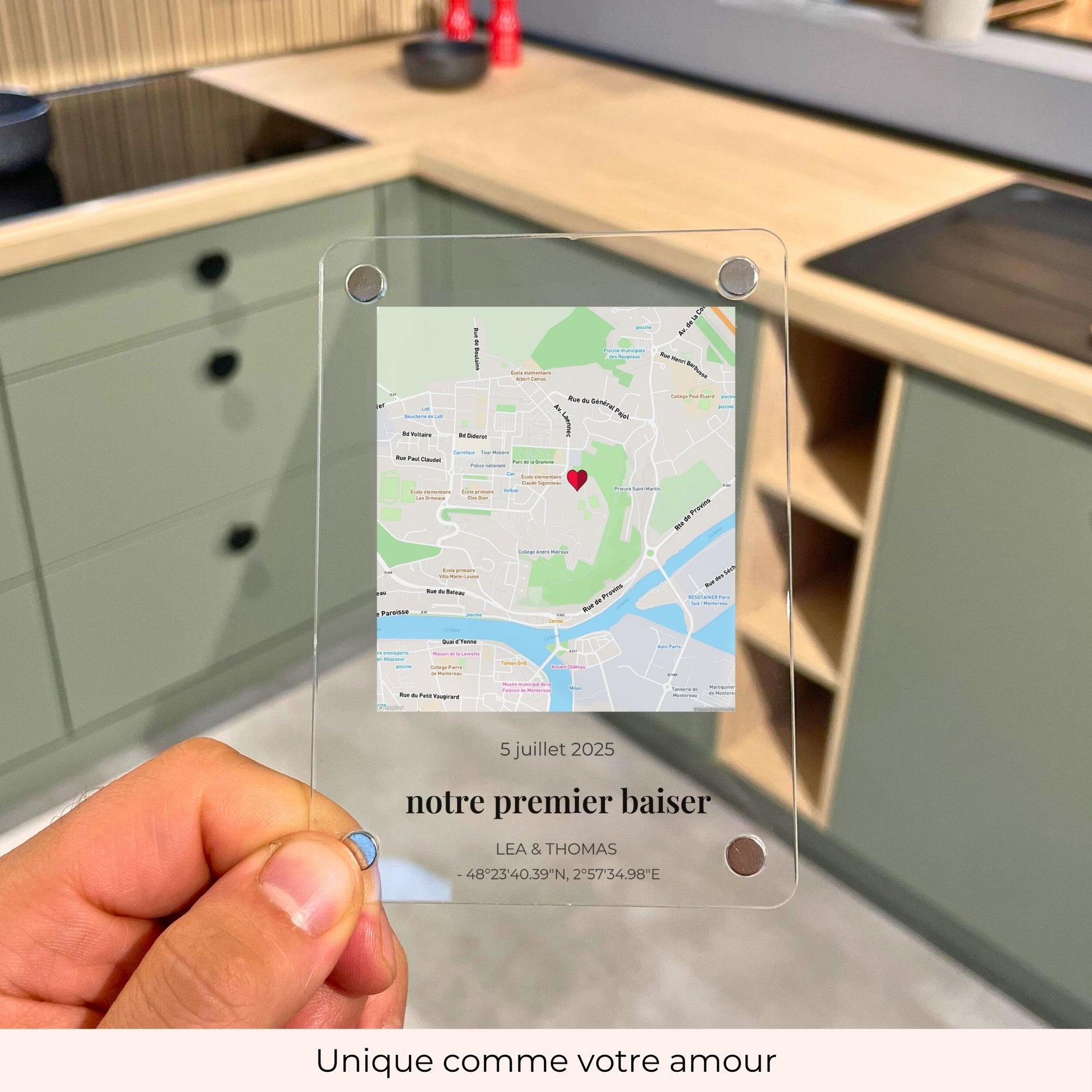 C’est pourquoi notre plaque en acrylique existe aussi avec un élégant support en bois – pour mettre ton lieu spécial en valeur, où que tu sois.